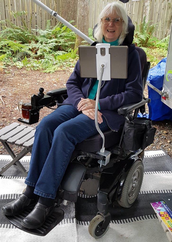 As Jen has her big chair back in service, she is using it more often so we outfitted it with a few accessories: A place to store items including water bottles (hanging off the left armrest, a coffee cup holder (off the right armrest) and a tablet holder. Here's the happy lady herself.